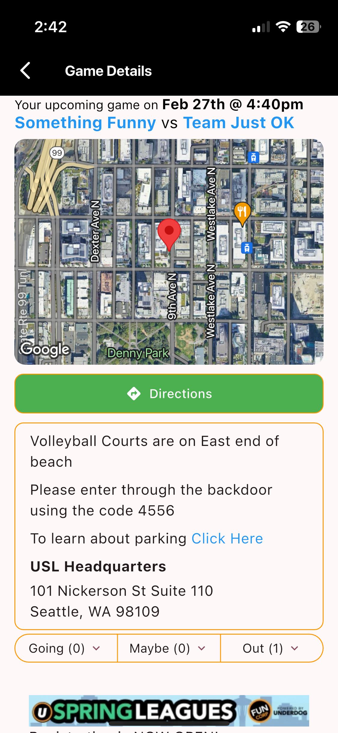 The game details page had to include three things: Directions and special access instructions (if necessary) and RSVP view/options.We paid special attention to the special instructions. Special instructions are certain things that new players may not know about where they’re playing: Gate codes, no parking areas, etc. Because we catered the app to new and indy players (”indiy” = independent players: players who aren’t part of a set team and/or frequently sub for teams) this was necessary for them to enjoy their games, return to the app, and rate their games.